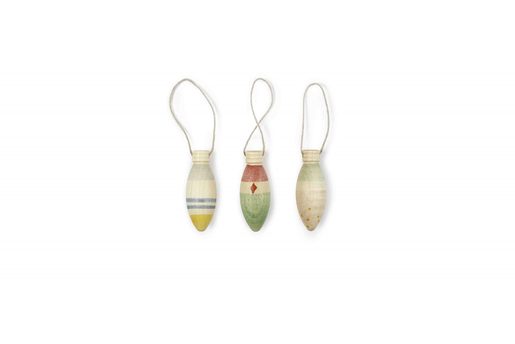 3 lamp-shaped pieces, painted by hand. Includes thread for hanging.